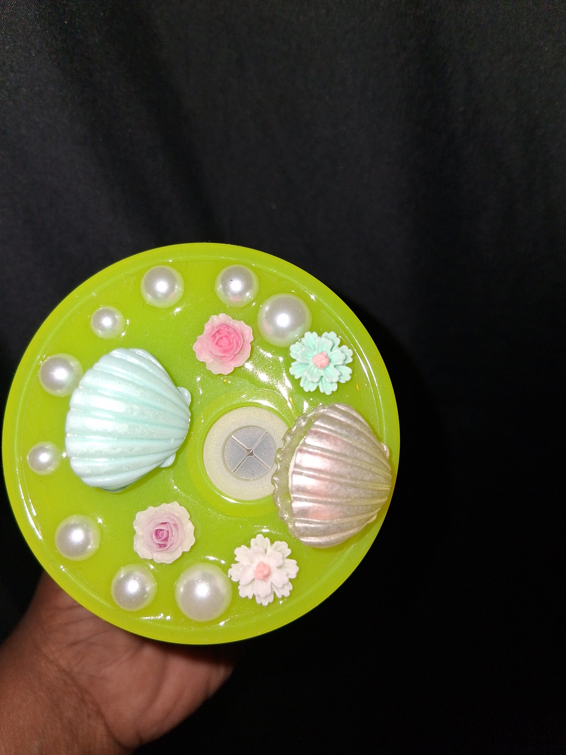 Beach cup with decorative lid with mermaids inside of a seashell with pearls and flowers.